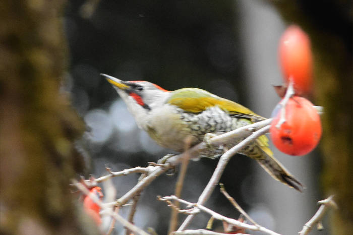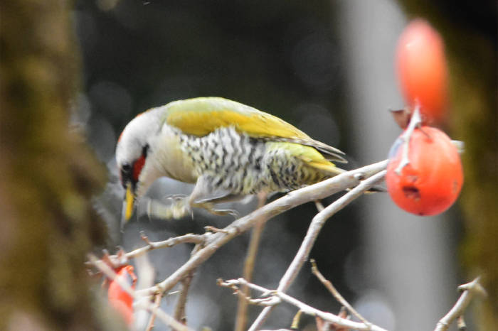 海上の森で柿の木にアオゲラ飛来