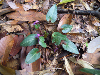 写真は、そのチゴユリのすぐ手前に生えていたミドリミツモリスミレです。