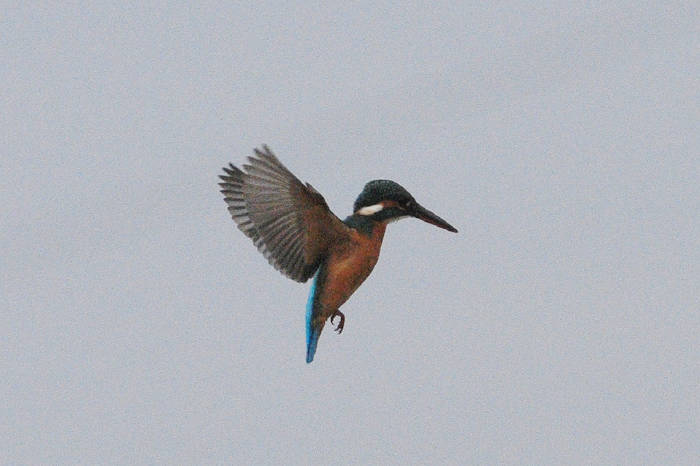 カワセミが空中でホバリングしていた。
