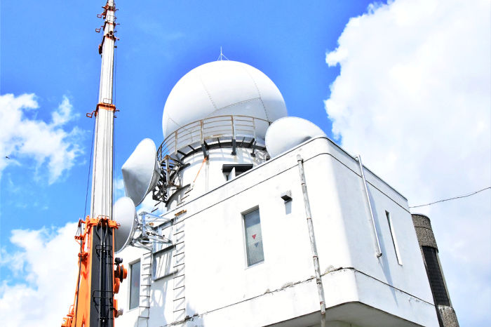 電波塔のアンテナ取り換え工事中
